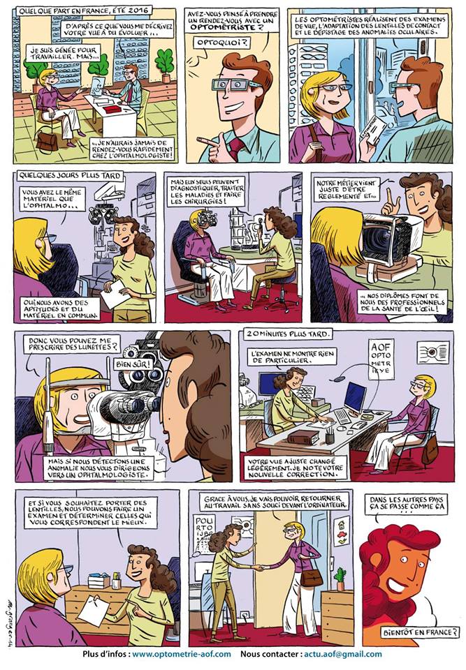 Dans mes points positifs, j'ai été reçue par plusieurs députés et sénateurs pour expliquer notre profession, nos souhaits pour la filière visuelle, pousser à soutenir des propositions de lois sur l'optométrie. On a réussi à obtenir de nombreuses questions à l'assemblée nationale, on pensait qu'à force de les poser, ça allait les saouler et les intéresser à regarder d'un peu plus près. On a réussi sur plein de points, mais en vrai, la politique sur la filière visuelle, sans rentrer dans les détails c'est compliqué, et je tire un chapeau à la ténacité de l'AOF ! J'ai entrepris la réalisation d'une BD qui à l'époque était futuriste, je projetais une réglementation pour 2016 : C'EST LOUPÉ, on est en 2025 et on a encore moins de droits qu'à l'époque MDR ! On montrait ce qu'allait apporter l'optométrie quand elle serait réglementée, ça a été mon projet-bébé ! On avait pas d'IA à l'époque, j'ai été chercher un illustrateur à Paris, et j'ai tout géré de A à Z, j'y ai même fait mettre un mot doux dans l'avant dernière case ♥️